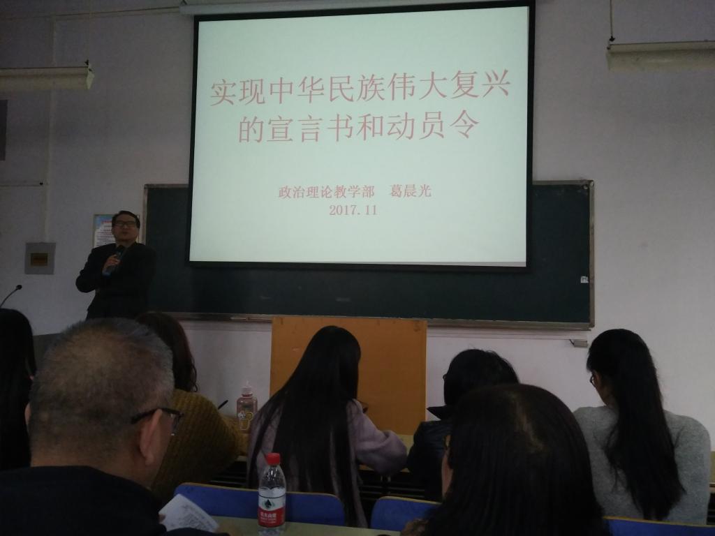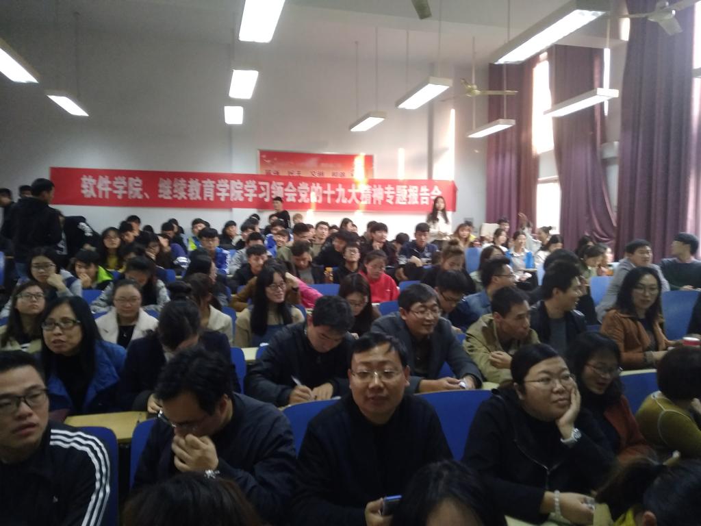 10月30日下午,在14号教学楼104教室,继续教育学院全体教职工与软件学院部分师生200余人,聆听了党的十九大精神辅导报告会,报告会由政治理论教学部主任葛晨光教授主讲。