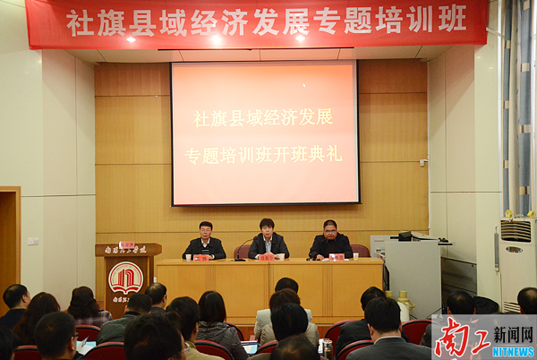 由社旗县委、政府和我院联合举办的社旗县域经济发展专题培训班开班仪式11月2日在会馆报告厅举行。副校长张伟出席仪式并致辞。47名学员及成人教育学院相关负责人、工作人员参加仪式。